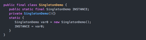 应该很难把 object xxx 这短短一行代码称作一种设计模式吧?( kotlin编译器将其范式隐藏在编译期,以下是decomplile字节码得到的kotlin饿汉式范式)