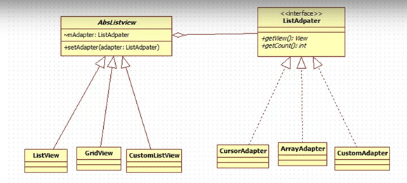 首先我们知道要想使用ListView必须给它设置一个adapter。也就是说设计者给它加上了一个适配器模式。那么为什么需要一个适配器模式呢? 我们都知道适配器模式是用来拼接两个或多个本不兼容的接口,那么ListView需要adapter来对接什么接口呢? 我理解是 数据&绘制流程 的接口。怎么理解?作为设计者,他知道listview需要一个getView(int position)接口来渲染每个item,但是他不知道上层用户提供的数据接口是怎样的 (可能是一个pojo,可能是多个), 所以他抛出了一个adapter让用户自己来对接数据与控件. (这里所说的数据和绘制流程接口是一个抽象的概念,并不指interface)。 这里就有一个问题,不用适配器模式的话,该怎么实现呢? 其实listview直接抛出一个抽象接口getView(int position)难道不行吗?继承也是可以的, 但是继承会带来更多的问题(mn问题,性能问题,子父类耦合问题。并且我认为很多设计是为了消除继承)。另外,listview是怎么保持与adapter的关系的呢?