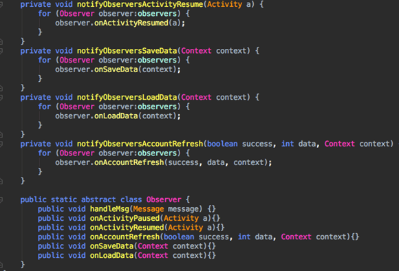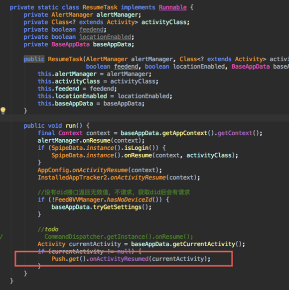 此类定义了一个ResumeTask内部类,在其关注的onActivityResume回调中调用,其中调用了push的接口,以及很多其他业务的接口。那么如何将接口收敛回push,并且还能继续关注BaseAppData提供的回调呢?其实一个简单的observer模式就可以做到。